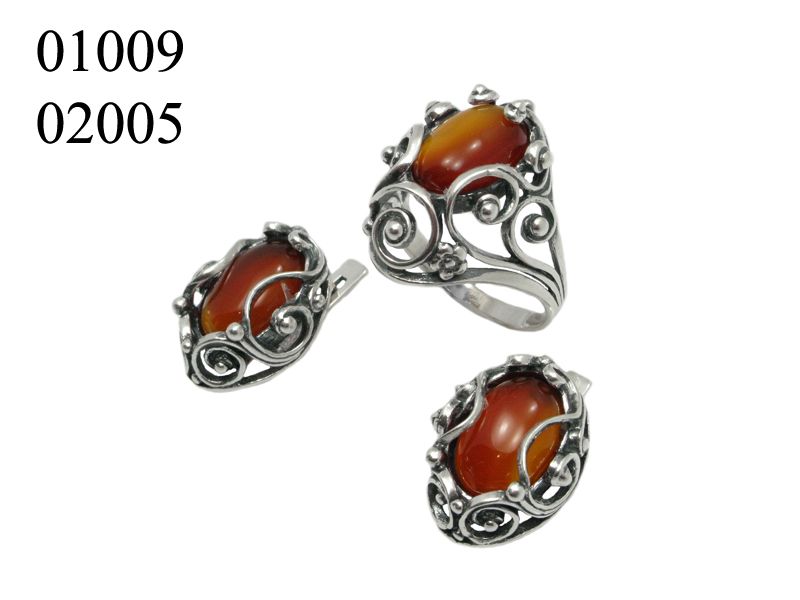 Комплект из серебра, украшенный традиционными для нашей ювелирной промышленности, узорами. Комплект достаточно массивный. В данном комплекте вставкой может быть: