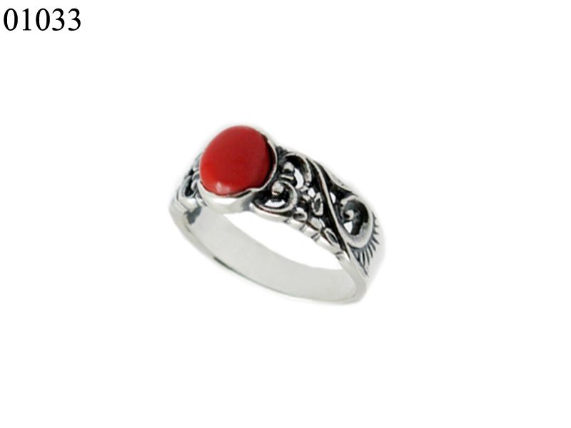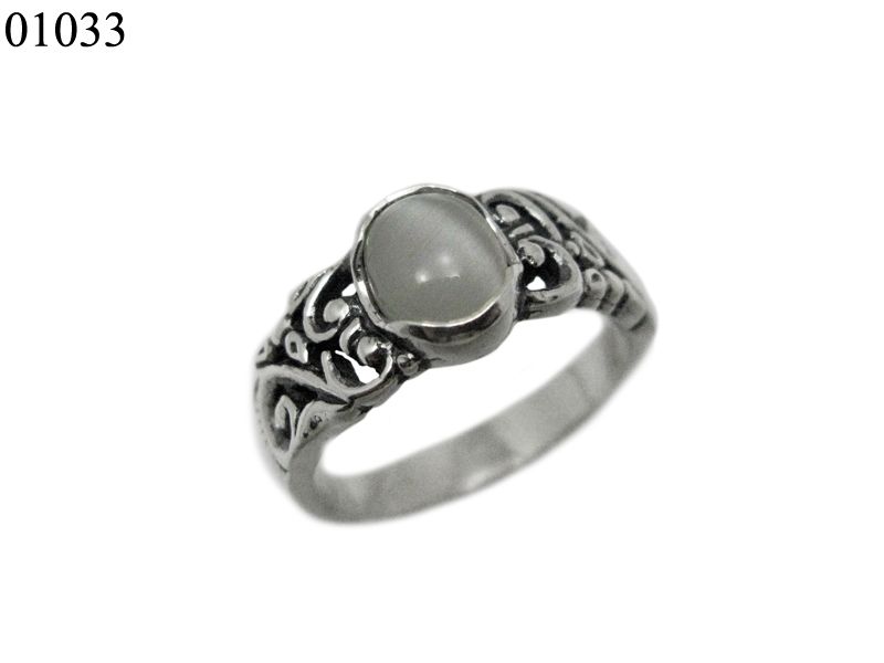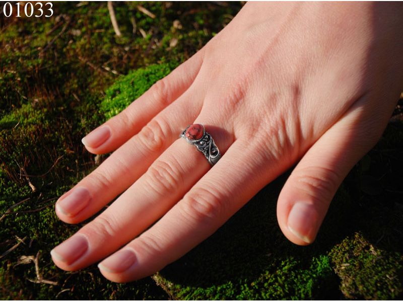 Оксидированная поверхность кольца прорисовывает узоры, которые расположились вокруг овального небольшого камешка.