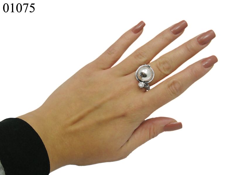 Поверхность шара блестит, сверкает, отражая все, что находится вокруг очаровательной обладательницы серебряного кольца «Притяжение». Этот блеск словно притягивает взгляды окружающих к утонченному пальчику девушки.