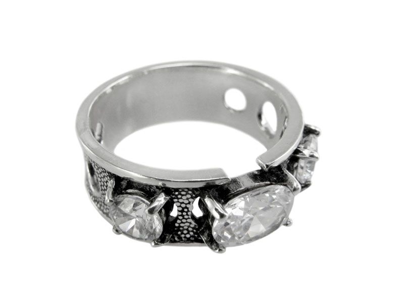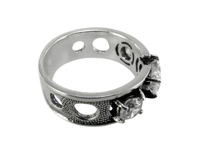 Простое кольцо в форме обручалки, но очень оригинального дизайна. Его декор - три крупных фианита черного или белого цвета и круглые прорези. Между камней серебро с оксидированной поверхностью.