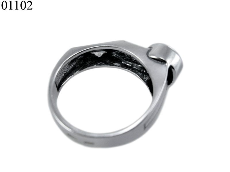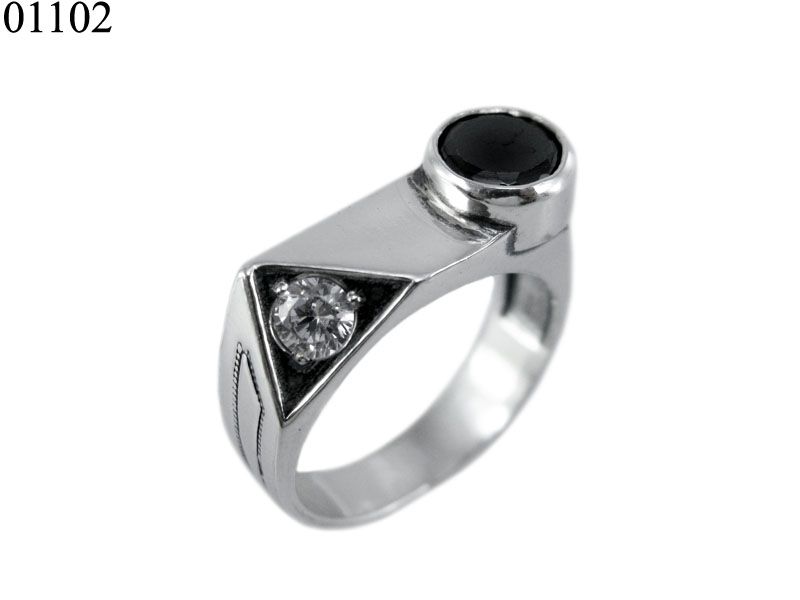 Пожалуй, самое оригинальное кольцо в коллекции мужских украшений! Кольцо из серебра имеет очень необычную форму: если представить верхнюю часть кольца как ровную прямоугольную площадку, то одна сторона округляется за счет вставки круглого камня, вторая же сторона срезана, образую треугольник со вставкой более мелкого фианита. Боковые стороны кольца также декорированы узором.