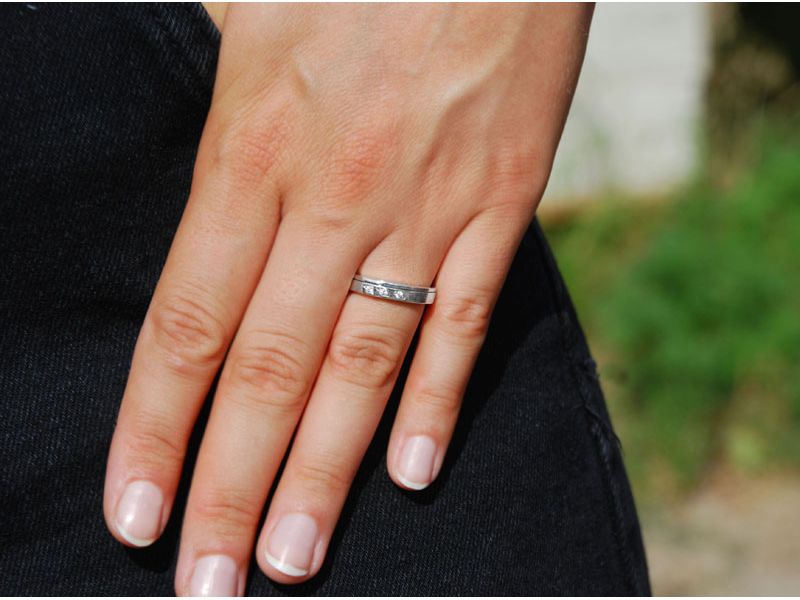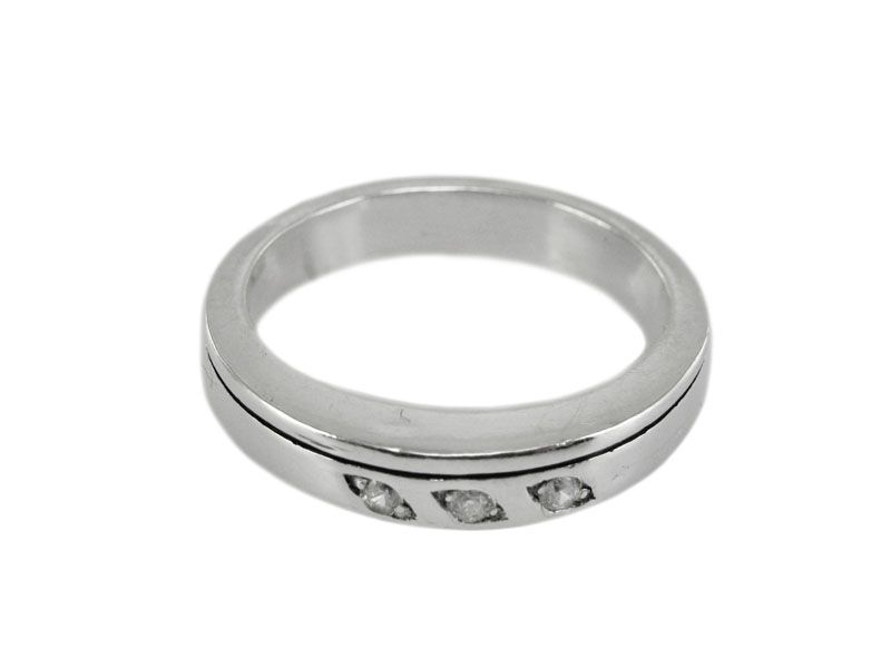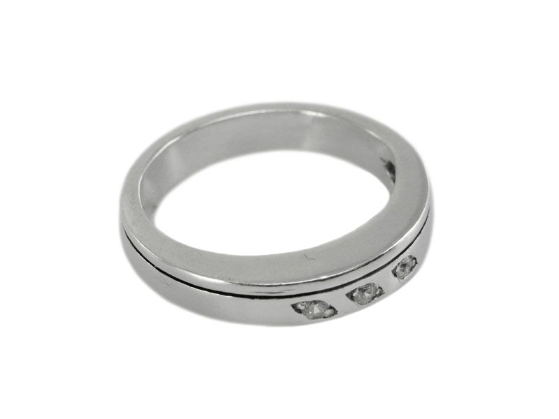 В данной карточке товара представлено серебряное кольцо «Нива» - лаконичная ровная гладкая поверхность, которая имеет классическую форму «обручалки». Кольцо утолщенное сверху и утонченное снизу. Это позволяет кольцу идеально сесть на пальчик любого размера (в рамках размерного ряда, конечно же). Декор простой и не броский – только три небольших белых кубических циркония и утонченная полоска, смещенная от центра в сторону.