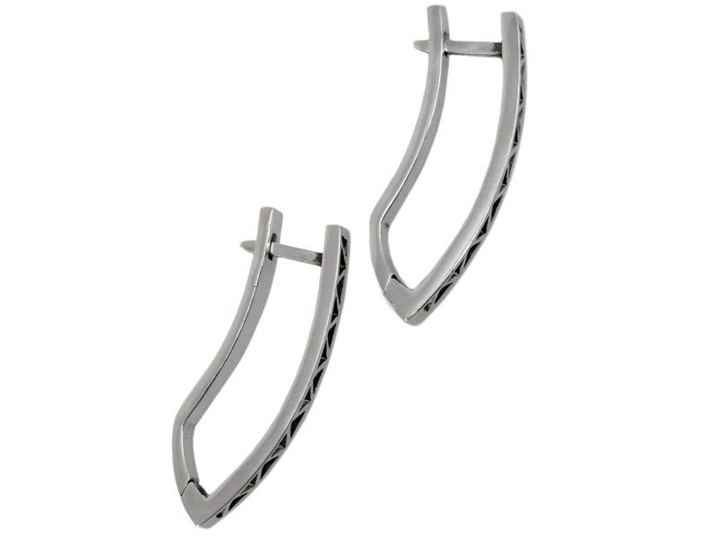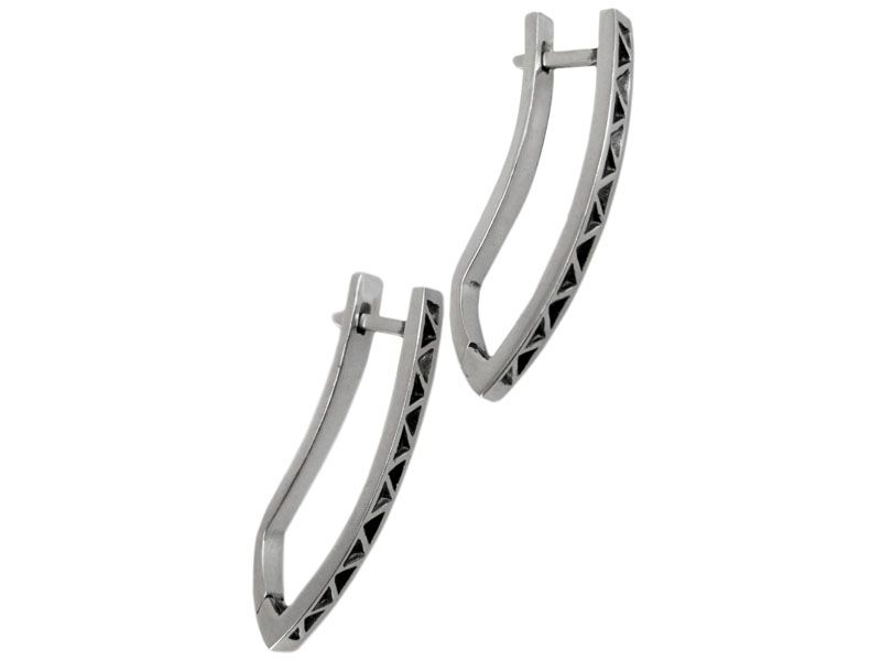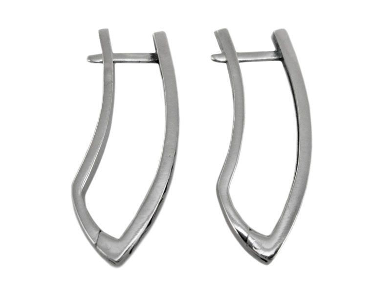 Серебряные серьги «Акула», без вставки, с оксидированной поверхностью (частично использовано чернение). Серьги вытянутые, украшены изогнутой линией («змейкой»), что создает геометрический узор.