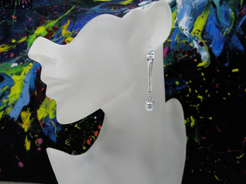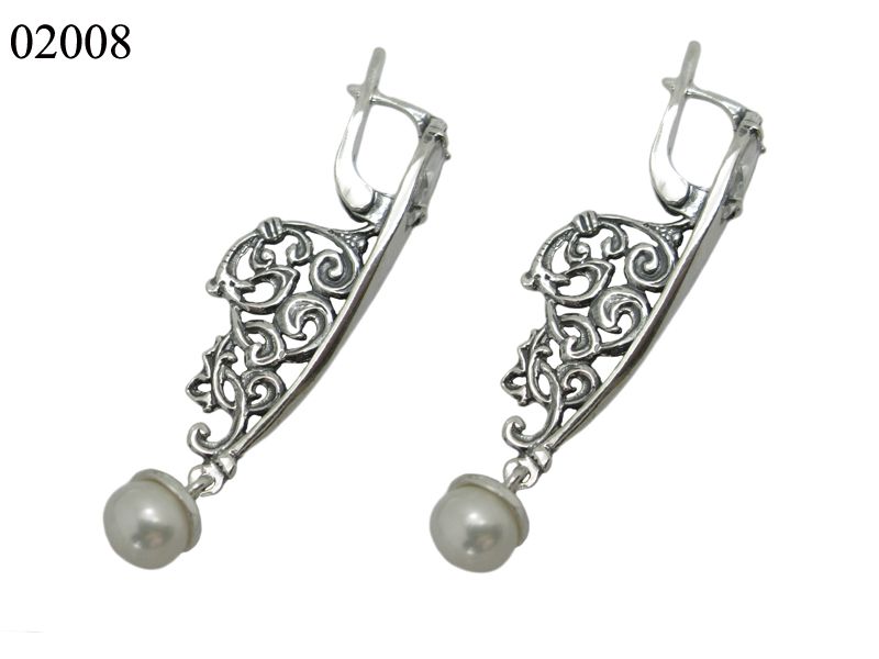 Серьги из серебра необычны по своей форме и конструкции. Впереди серьга имеет удлиненную узкую гладкую поверхность, декорированную кубическим цирконием «маркизом», а также подвижным жемчугом. Сбоку же серьги выглядят иначе – прорезные ажурные узоры, что в корне отлично от фронтального вида.