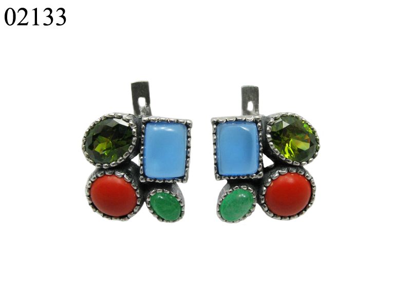 На фото изображены сережки с кошачьим глазом, фианитом фиолетового цвета, кораллом и хризопразом. На наш взгляд это самое удачное сочетание.