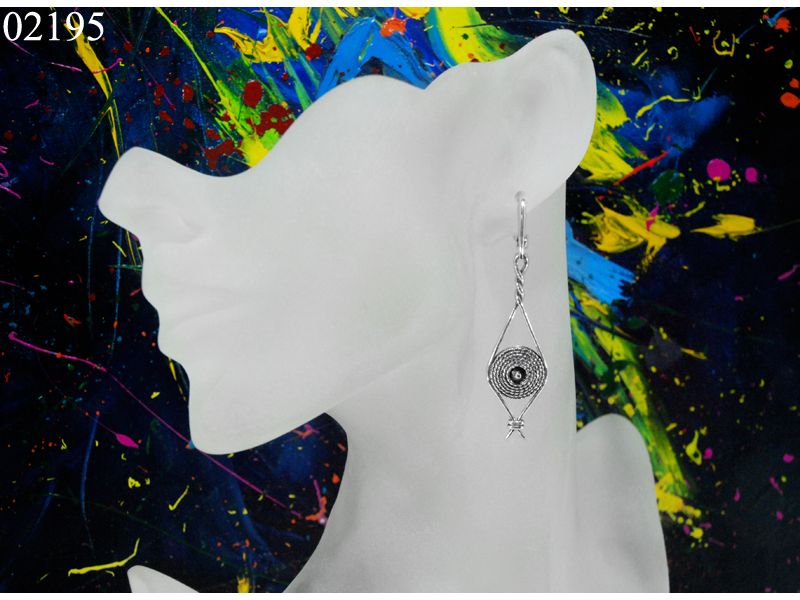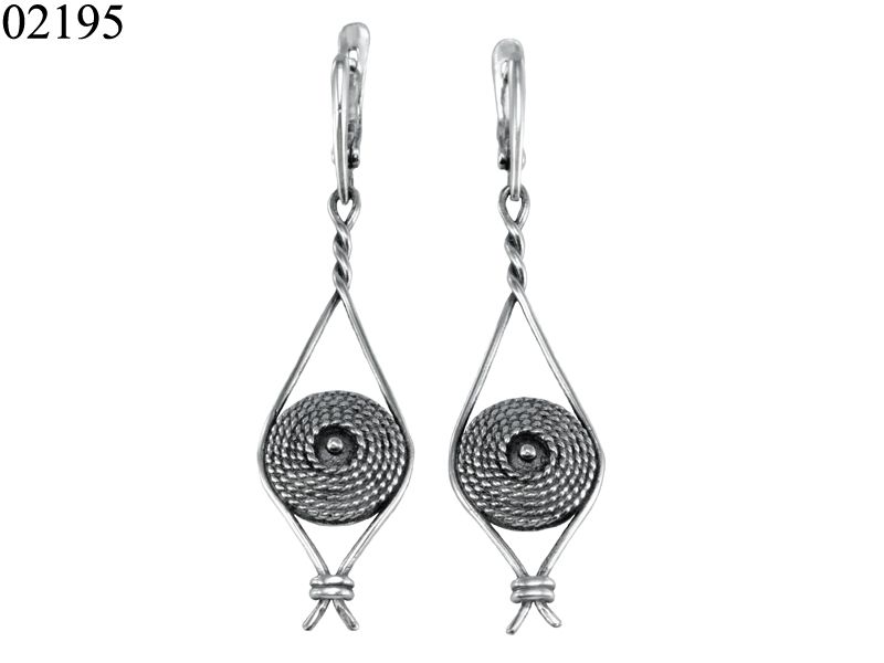 Перед Вами – серебряные серьги «Гонг» из гарнитура с одноименным названием. Серьги в стиле бохо-шик. Поверхность черненая, использована техника филиграни. Сережки длинные, но при этом не массивные.