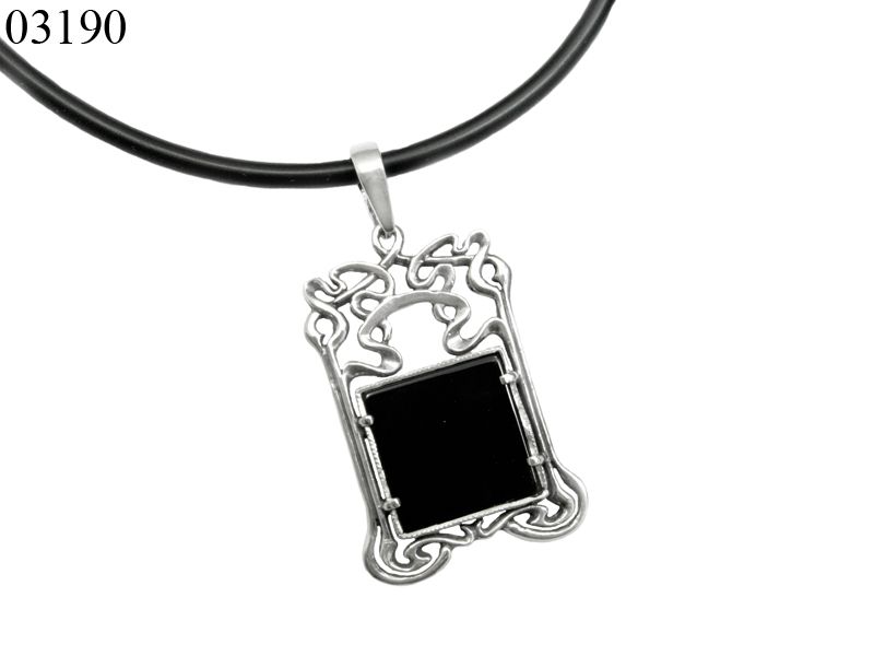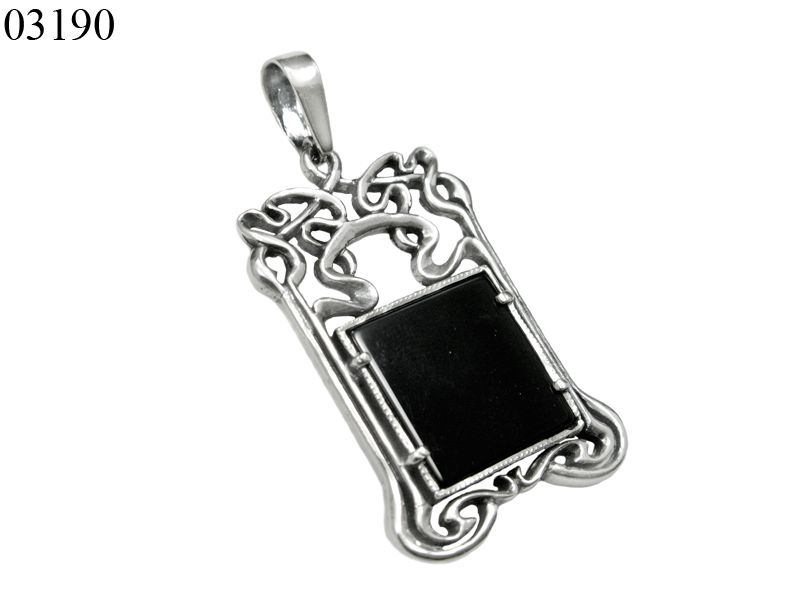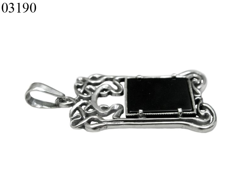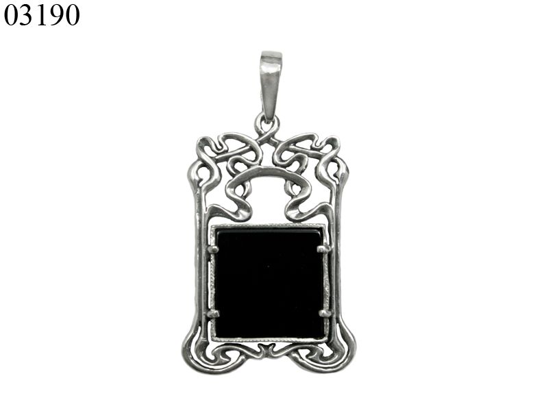 Подвес из серебра 925 пробы «Авангард» имеет условную форму прямоугольника. В центре «панно» - черный квадрат. Это плоский кабошон черного оникса. Поверхность натурального камня идеально гладкая и блестящая. Камень, словно картина «Черный Квадрат», взята в шикарную рамку из серебряного узора.