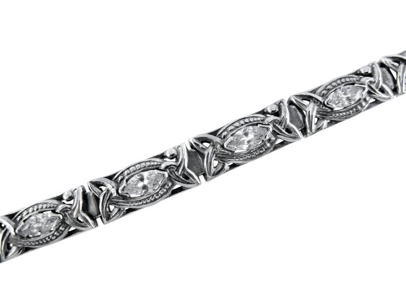 Серебряный браслет «Конфетка» состоит из повторяющихся прямоугольных элементов. Внутри каждого сегмента – прозрачный (или лавандовый) кубический цирконий «маркиз» (знаменитая форма «лодочки»). Каждый элемент также украшен узором, который и напоминает конфетку. Но нужно подчеркнуть, что сочетание узора и камней выглядит не вульгарно, не наляписто.