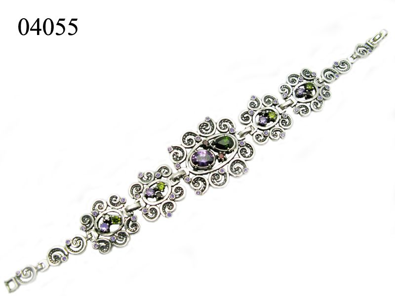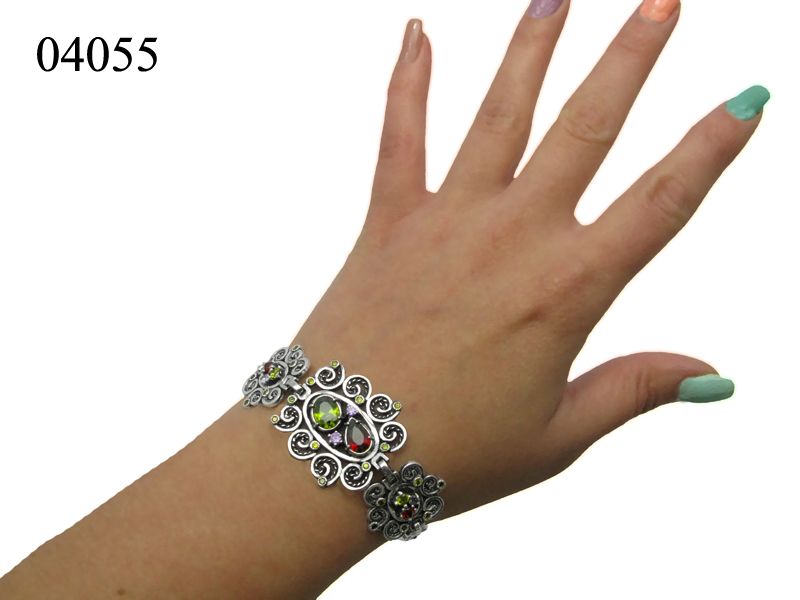 Роскошный браслет, выполненный с серебра самой высокой пробы, декорированный разноцветными цирконами, для того, чтобы изделие приняло модный сегодня стиль «под старину» его оксидируют и добавляют элементы филиграни.