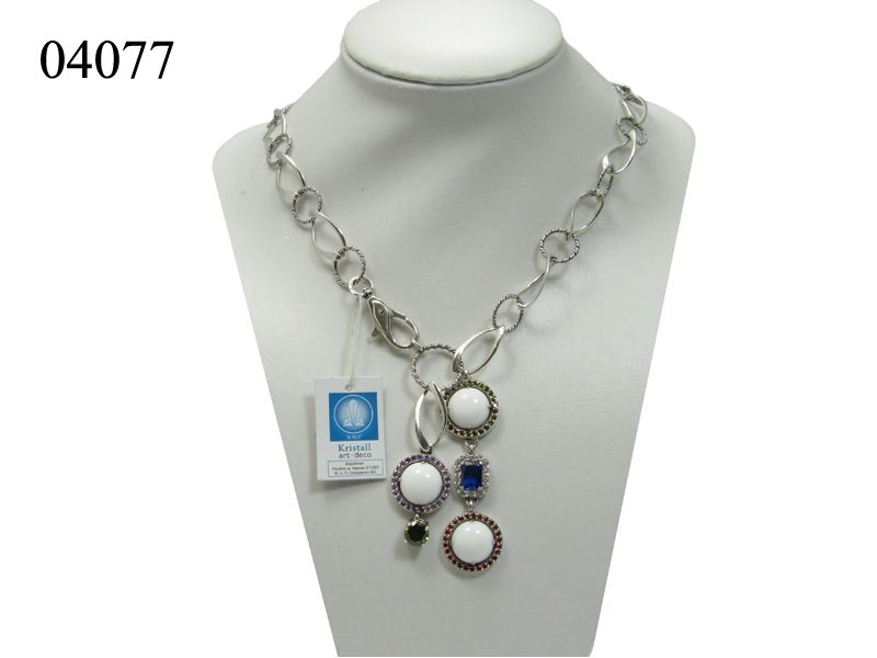 Еще одна новинка от украинского производителя Kristall Artdeco – серебряное колье «Гламур». Серебряное украшение представляет собой широкую декоративную цепочку, которая украшена по центру двумя удлиненными элементами с камнями разной формы и цвета. Эти элементы подвижные, разной длины. Сама цепь состоит из двух видов звеньев – круглые и овальные закрученные.