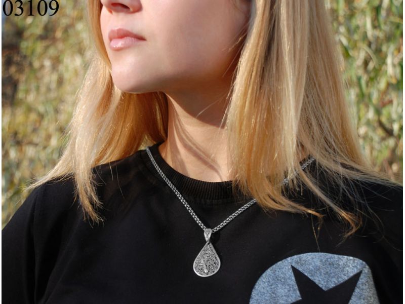 Серьги удлиненные, расширенные к низу. Форма кулона повторяет конструкцию серьги. Если даже у девушки длинные волосы, такой комплект не спрячется даже за самыми длинными и пышными волосами.