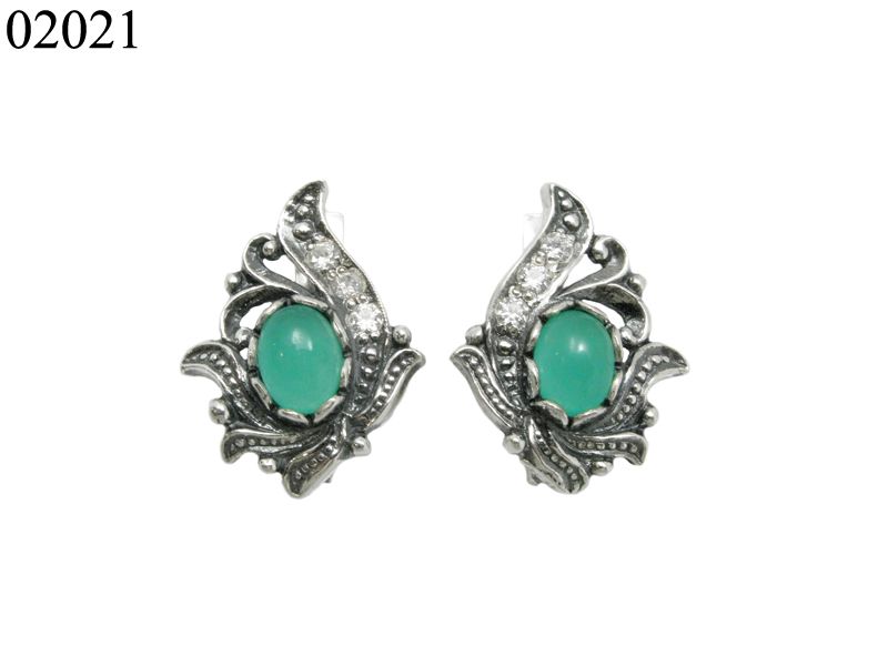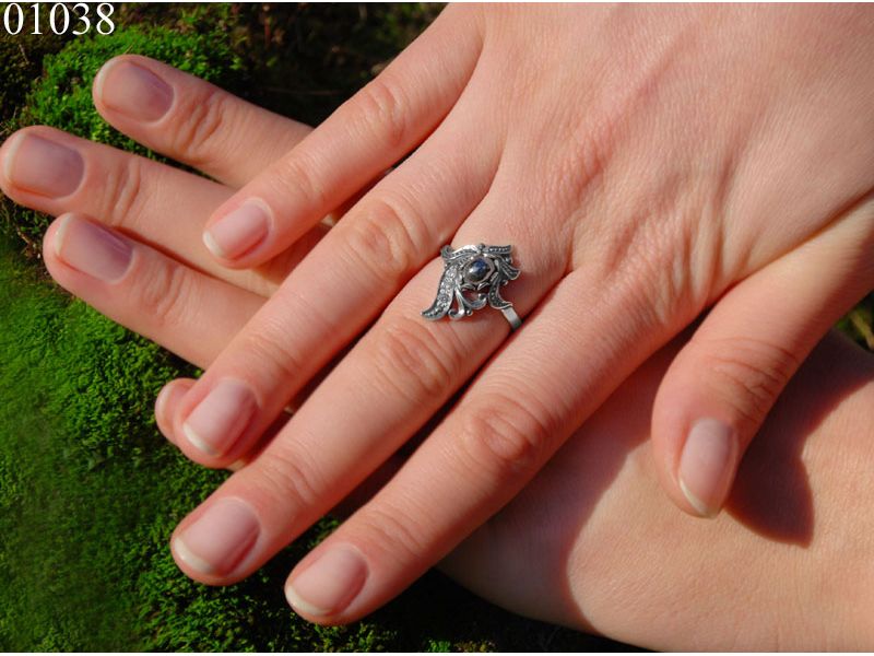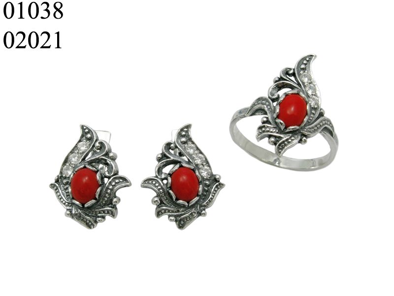 Серьги и кольцо декорированы интересным элементом, который напоминает пламя огня. По центру расположен овальный натуральный камень, а над ним сбоку – три круглых белых кубических циркония. Кроме камней, на основном декоре расположены мелкие и утонченные элементы – завитки и прорези, разнообразные шарики. Поверхность же полностью оксидированная.