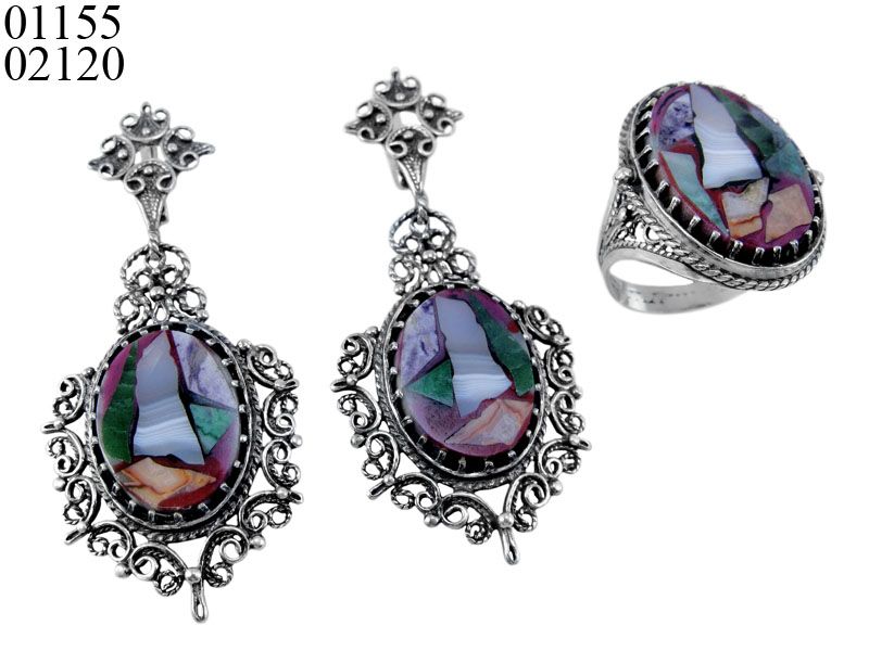 Удивительный комплект, который привнесет в Ваш образ оригинальность и яркость. Здесь каждая деталь удивляет и радует: чудесная филигрань соседствует с черненым серебром 925 пробы, а натуральные камни представлены в виде мозаики.